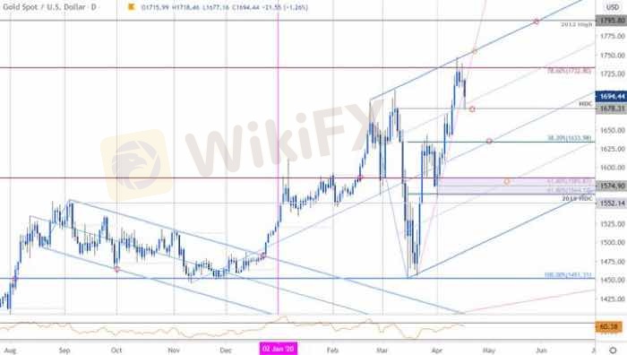 Technical Outlook: In my last Gold Price Outlook we noted that the XAU/USD rally was vulnerable heading into the close of March trade and that, “ultimately a larger pullback may offer more favorable entries with a breach of the highs needed to keep long-bias viable.” Price plummeted more than 5% to register a low at 1560 before ripping to fresh yearly highs into the April open.