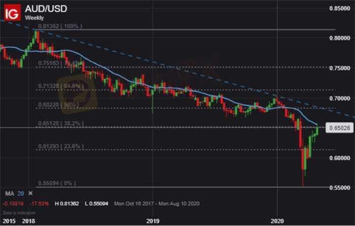 The Australian Dollar faces a pivotal inflection point as AUD/USD price action rallies into a huge area of resistance. This technical barrier, which threatens to send AUD/USD recoiling back lower, is highlighted by a confluence of its 20-week moving average and 38.2% Fibonacci Retracement level of the January 2018 to March 2020 trading range.