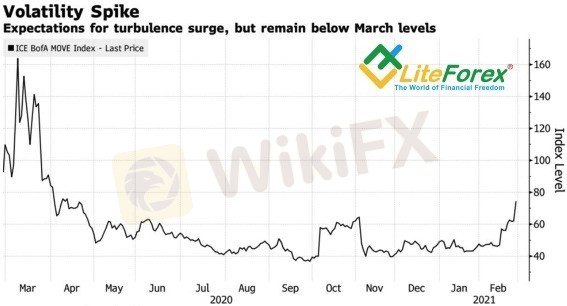 В конце 2020 эксперты Bloomberg предполагали, что доходность 10-летних трежерис на фоне восстановления экономики США вырастет с 1% до 1,5%, однако мало кто мог предположить, что все будет происходить так быстро. Когда ставки по долгам поднимаются, теоретически, это не должно пугать владельцев акций. Бурный рост ВВП, как правило, приводит к увеличению корпоративных прибылей, что создает попутный ветер для S&P 500. Похоже, ралли доходности трежерис связано не только с верой в быстрое восстановление американской экономики, как пытаются в этом убедить инвесторов чиновники FOMC. И взлет волатильности рынка облигаций свидетельствует, что крест на распродажах ставить слишком рано.