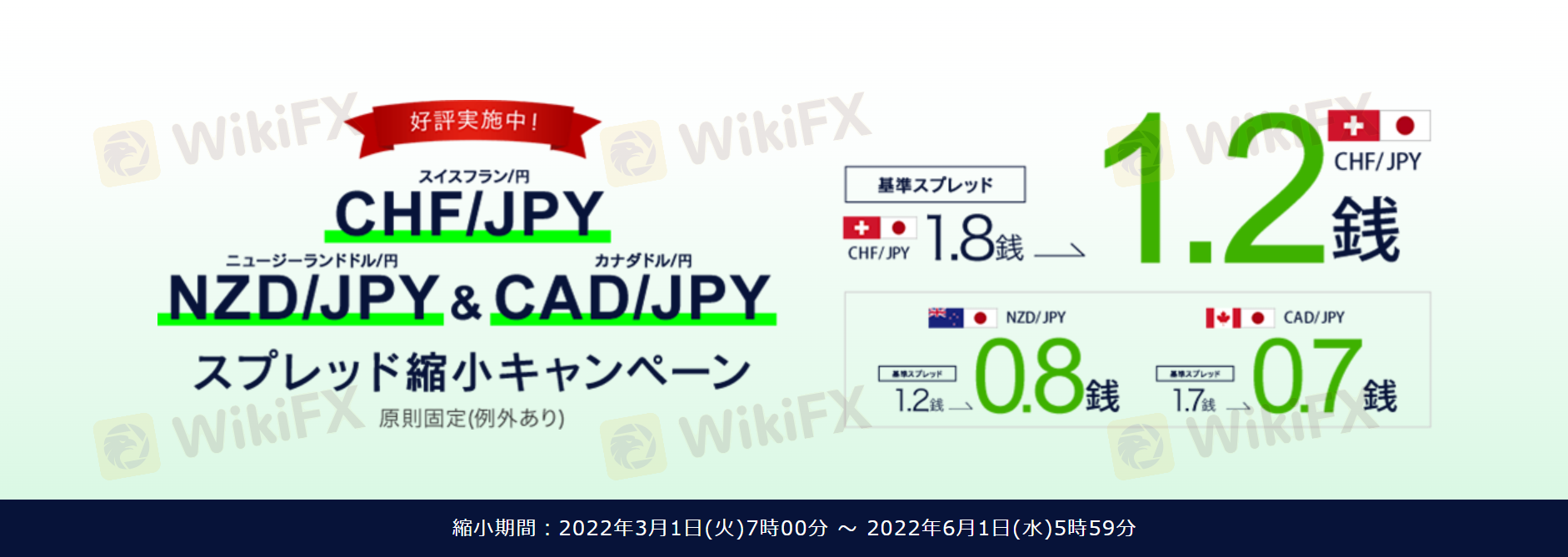 縮小期間 2022年3月1日(火)7時00分 ~ 2022年6月1日(水)5時59分 キャンペーン中スプレッド※1※2 原則固定(例外あり) CHF/JPY 1.2銭 スイスフラン/円 NZD/JPY 0.8銭 ニュージーランドドル/円 CAD/JPY 0.7銭 カナダドル/円 キャンペーン中スプレッドは原則固定されたスプレッドです。(例外あり※2) 上記、キャンペーン中スプレッドは固定されたスプレッドではありません。リーマンショックや東日本大震災のような突発的な事象が発生した場合や、市場の流動性が低下している場合(月曜日の午前7時~午前8時頃、夏時間の午前6時前後(冬時間の午前7時前後)、年末年始、クリスマス時期など)、経済指標の発表前後の時間帯等においては、スプレッドが拡大する場合があります。また、当社がカバー先等から受信するレートのスプレッドが拡大した場合は、お客様に配信する外国為替レートのスプレッドも拡大します。なお、その上限は一定値に限定されません。 注文の成立に伴い、スリッページが発生する可能性があります。スリッページとは、一般的に注文時の表示価格と約定価格との差を指していますが、当該価格差については、お客様にとって有利な場合もあれば、不利な場合もあります。 スプレッド縮小期間は、当社の都合により予告なく変更・中止になる場合がございます。予めご了承ください。