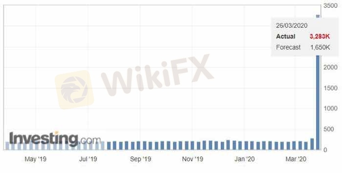 Ожидаемо вышли плохие данные по безработице в США. Количество первичных заявок на получение пособии – 3,238 млн при прогнозе 1,650 млн. заявок (прогноз ранее). Напомним, что предыдущее значение было 281 тыс.