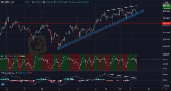 Четырехчасовой график золота показывает, что цена несколько раз поддерживалась восходящей линией тренда с 5 июня, и общая бычья модель очевидна. Однако и индикатор MACD, и индикатор KDJ показали признаки верхней и нижней дивергенции, и необходимо остерегаться риска резкого снижения после того, как рынок преодолеет отметку 1800.