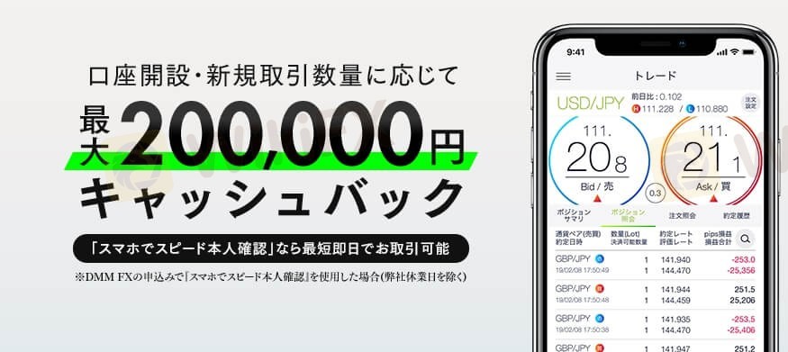 キャンペーン内容: DMM FXで新規口座を開設し、期間内に条件を満たす取引をしたトレーダーに最大200,000円のキャッシュバック キャンペーン期間: 随時 キャンペーン適用条件: ①DMM FXで新規口座開設を完了 ②口座開設完了日から3カ月以内に1,000Lot以上の新規取引数量を達成した方 キャンペーンの注意点: ①新規取引数量のみカウントされるので決済取引はカウントされません ②キャッシュバック付与時に解約されていた場合は対象外