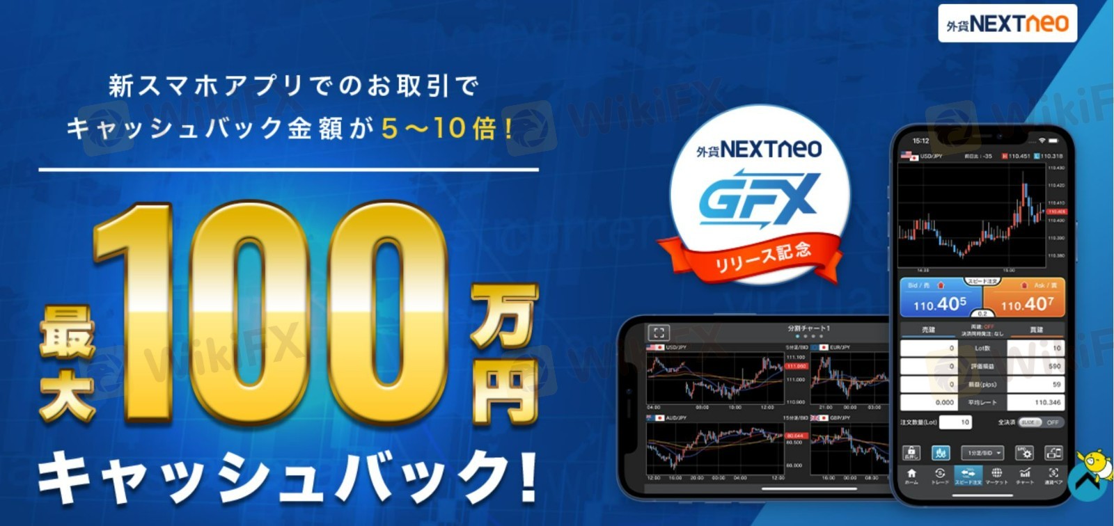 キャンペーン内容: 対象期間中に「米ドル/円」への新規注文で取引量に応じて最大100万円キャッシュバック さらに新スマホアプリ、外貨ネクストネオ「GFX」でのお取引ならキャッシュバック金額が5~10倍にアップ キャンペーン期間: 2021年11月1日(月)午前7時00分~2021年12月4日(土)午前6時55分 キャンペーン適用条件: ①キャンペーンにエントリーをする ②「米ドル/円」での新規注文が、1万通貨の倍数に達するごとに上限なくキャッシュバック キャンペーンの注意点: 対象期間中に所定のフォームからのエントリーが必要 ※キャッシュバック金額の入金時期 2021年12月末までに、特典の現金を「マイページ」内に入金いたします。当社での入金処理後、お客様の「自動振替先設定」に基づき自動振替されます。お客様ご指定の預貯金口座への入金はお受けできませんのでご注意ください。