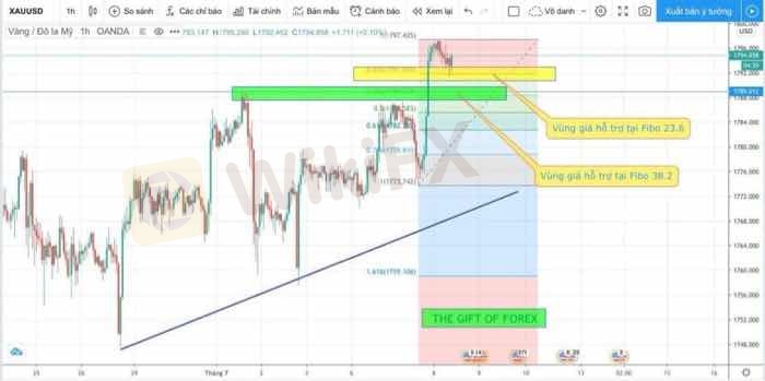 👉 Vàng hiện tại đang có tín hiệu đi lên sau khi cham vùng giá hỗ trợ Fibo 23.6. Thực ra trong một sóng tăng hay giảm mạnh thì việc giảm hay tăng điều chỉnh sẽ rất khó có thể đạt tới vùng Fibo 50 hay 61.8.