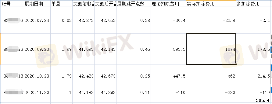 持续持有UKOil期货产品几个月了,之前没有注意,前段时间突然发现,期货产品展期从账户扣除的费用远远多于展期后与展期前的价格差,多次向在线客服反映,都未能解决,而且回复很是敷衍。本不是随便乱发评论的人,实在是想告诉大家不要上当,附带图片是我统计出来的自动展期多扣除证据。最后一张图片为实际扣除截图,展期时候持仓1标准手买单,展期后跳开11个点,应该只扣除我110$,实际扣除多了一倍。这只是部分账号,我有多个账号,总共被多扣除近2000$。